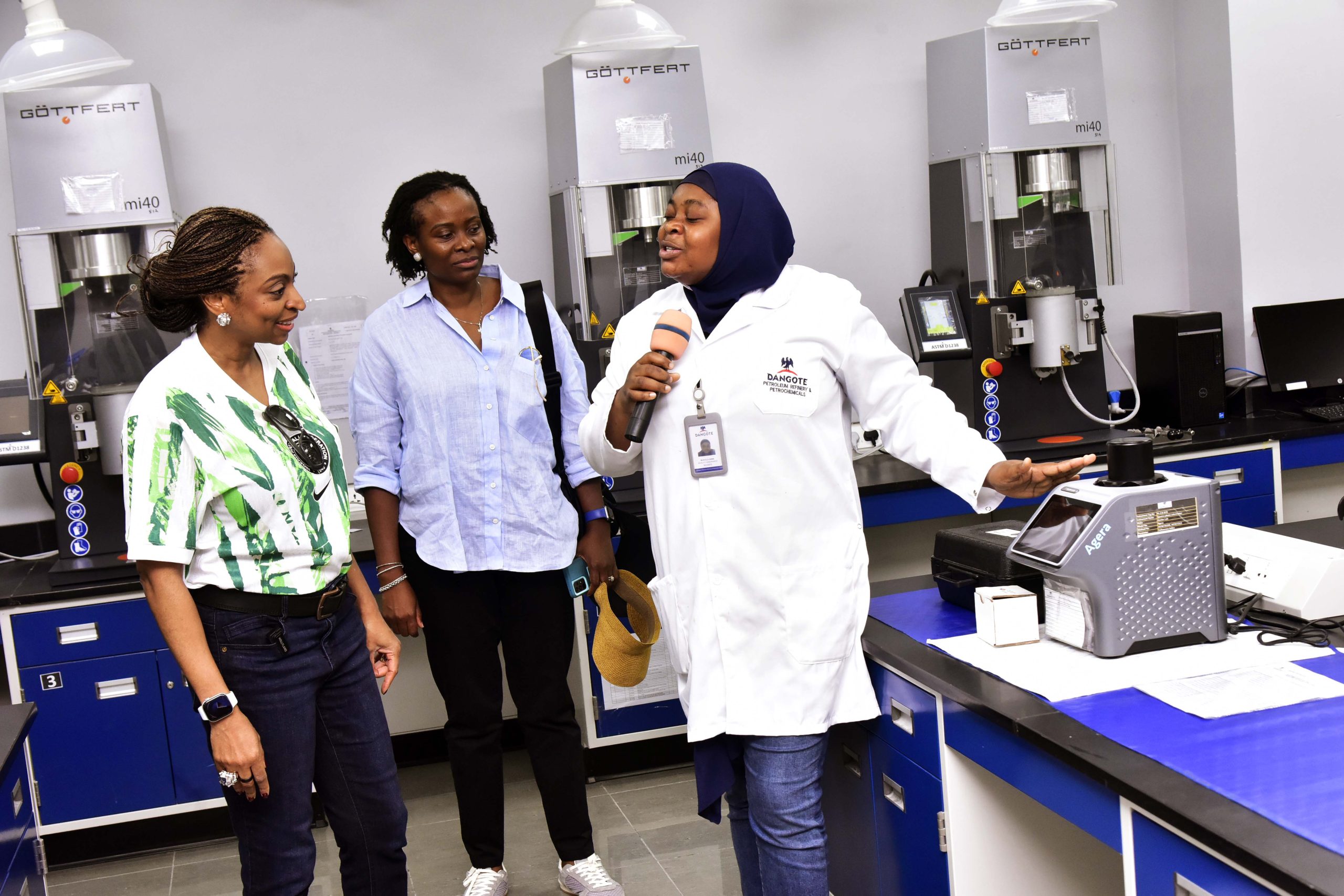 Photo Caption: Quality Assurance Officer, Dangote Petroleum Refinery Laboratory, Kabira Bukola, explains equipment in the petrochemical section to the Minister of Industry, Trade and Investment, Dr Jumoke Oduwole, during her visit to the Dangote Petroleum Refinery and Fertiliser Plant in Lekki, Lagos.