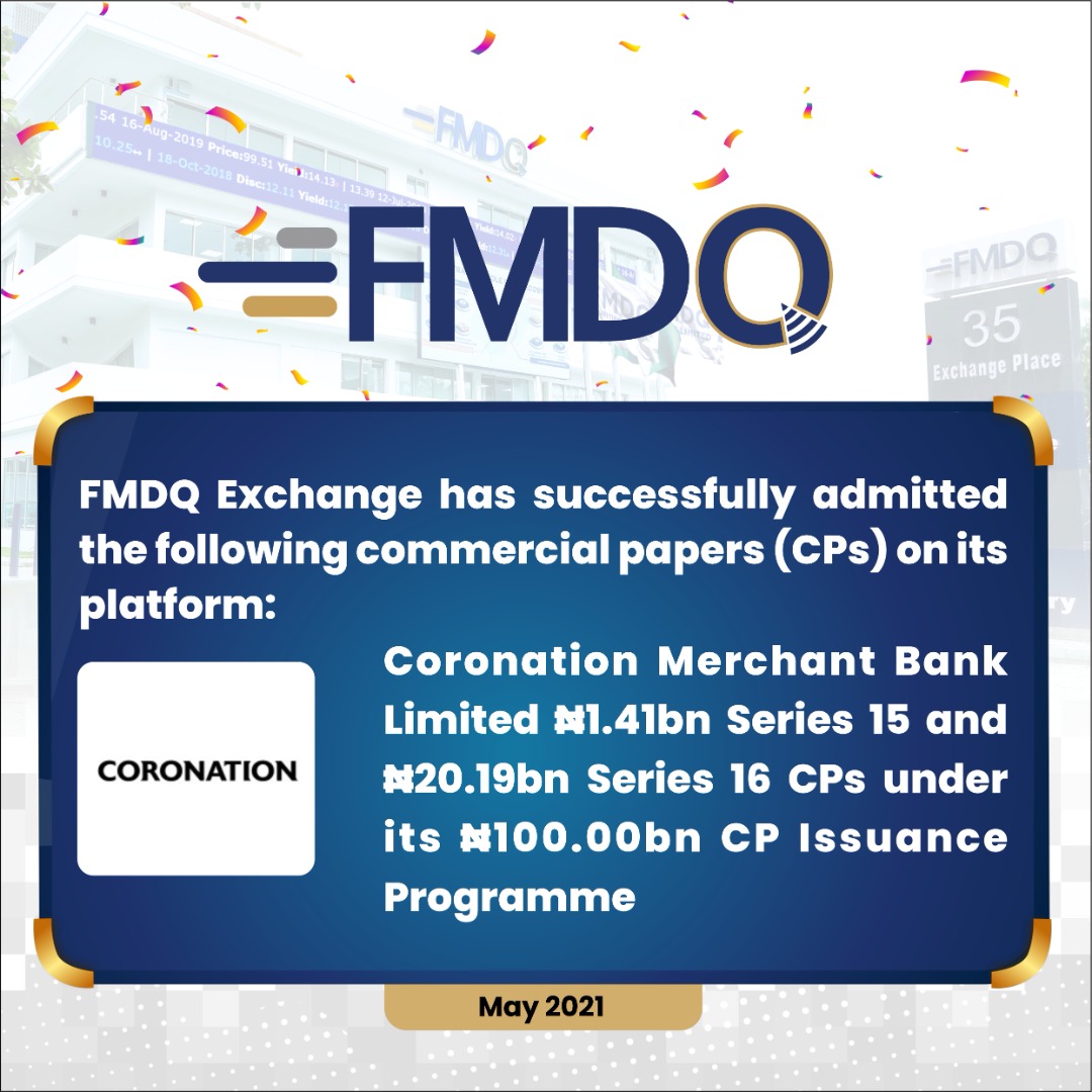 FMDQ Securities Exchange Limited (FMDQ Exchange), in providing the choice platform for the registration, listing, quotation, trading and recording of financial securities, approved the quotation of the Coronation Merchant Bank Limited ₦0.71 billion Series 13 and ₦14.13 billion Series 14 Commercial Papers (CPs) in March 2021, and the ₦1.41 billion Series 15 and ₦20.19 billion Series 16 CPs in May 2021, both under its ₦100.00 billion CP Programme, on its platform. The net proceeds from these CPs will support the Issuer’s short term funding requirements.