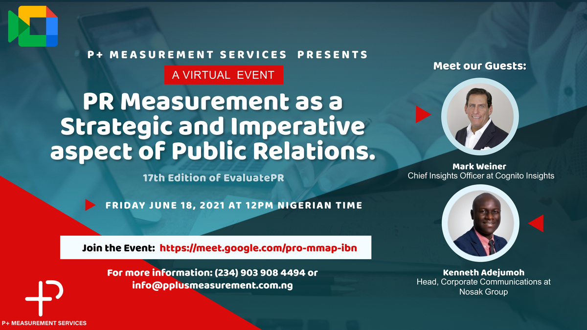 P+ Measurement Services, a leading Media Intelligence and Performance agency in Nigeria, cordially invites Public Relations and Communications professionals to its 17th Edition of Evaluate PR event.