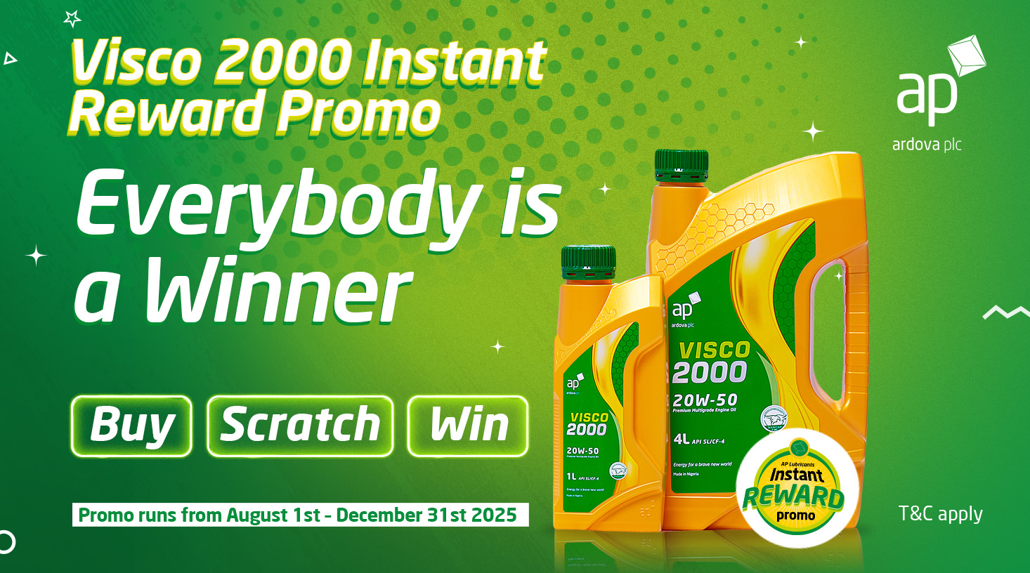 The AP Visco 2000 Instant Reward Promo runs from August 1, 2025 to December 31, 2025, while promo stocks last. Terms and conditions apply. Visit www.ardovaplc.com or follow @ardovaplc on social media for more information.