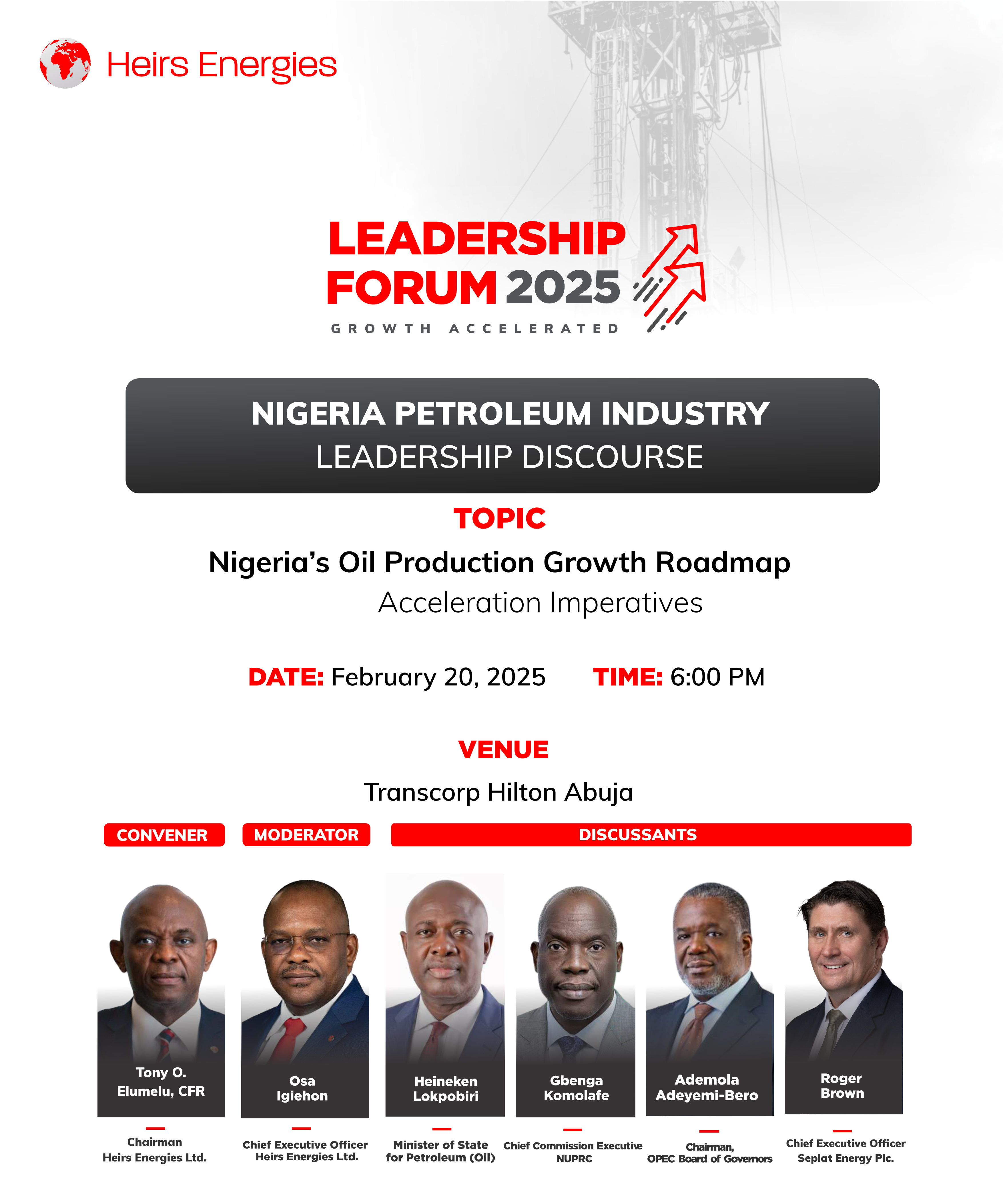 The forum, themed “Nigeria’s Oil Production Growth Roadmap Acceleration Imperatives,” will feature distinguished speakers including Sen. Heineken Lokpobiri, Minister of State for Petroleum Resources (Oil); Engr. Gbenga Komolafe, Chief Commission Executive, NUPRC; Adewale Adeyemo-Bero, Chairman, OPEC Board of Governors and CEO of First E&P; and Roger Brown, CEO of Seplat Energy Plc. The session will be moderated by Osayande Igiehon, CEO of Heirs Energies.