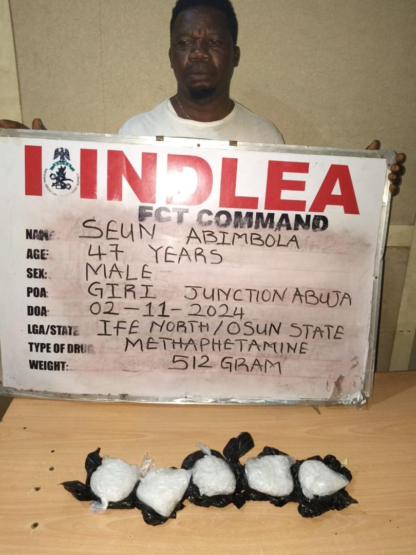 In the Federal Capital Territory, FCT, a suspect Mujahid Hamisu, 24, was arrested with 147,000 pills of tramadol concealed in black nylon bags containing plumbing materials along Kwali-Gwagwalada Abuja expressway on his way from Onitsha, Anambra state on Saturday 2nd November 2024, while another suspect Seun Abimbola, 47, was nabbed by NDLEA operatives same day with 512 grams of methamphetamine during a raid operation at Giri junction area of the FCT.