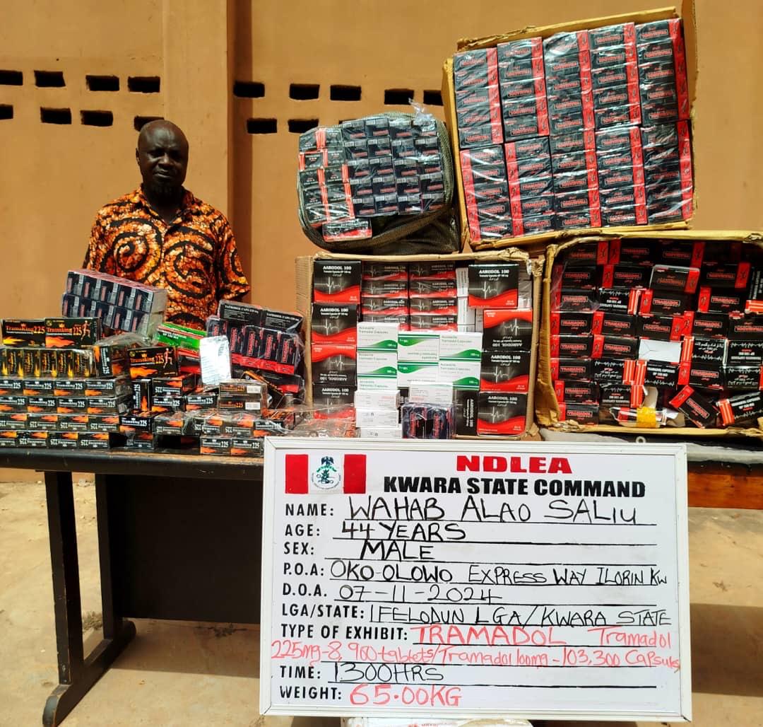In Kwara state, not less than 162,800 pills of opioids were seized by NDLEA operatives from four suspects during interdiction operations in parts of the state. While 112,200 tablets of tramadol were recovered from Wahab Alao Saliu, 18,900 tablets of same opioid were recovered from Dalha Musa both at Eiyenkorin area of Ilorin; 29,000 pills of tramadol, 200 ampoules of diazepam and 99 bottles of codeine syrup seized from Ahmed Isiaka, just as 2,500 tabs of tramadol were seized from Ahmed Garba, both at Bode Saadu in Moro local government area of the state on Friday 8th November.